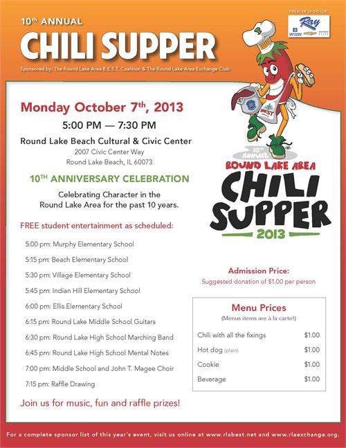The Round Lake Area B.E.S.T. Coalition (Bringing Everyone’s Strengths Together) and the Round Lake Area Exchange Club host their 10th Annual Chili Supper on Monday, Oct. 7th.